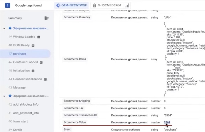 Зараз станемо розбиратися де взяти Conversion value. Пам’ятайте, завантажили контейнер, з купою різних параметрів. Повертаємося у відладчик, натискаємо Purchase, йдемо у змінні. Тут трошки гортаємо вниз і шукаємо що відповідає Value. Бачите, Ecommerce Value – 2564. Повертаємося в Google Ads, натискаємо плюсик і шукаємо Ecommerce Value. Знайшли.