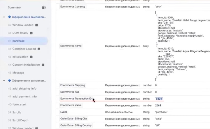 Те саме стосується Transaction ID. Якщо цього Purchase немає – потрібно просто натиснути preview в Google Тег Менеджері, пройти всі етапи і знайти змінні. Transaction ID також є. Transaction ID, де він Transaction ID.