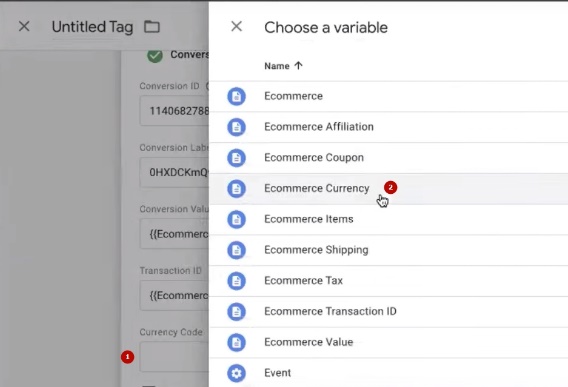 Що ще можемо? Currency код потрібен. Currency точно також є. “Ecommerce Currency”. Можемо вибрати Ecommerce Currency.