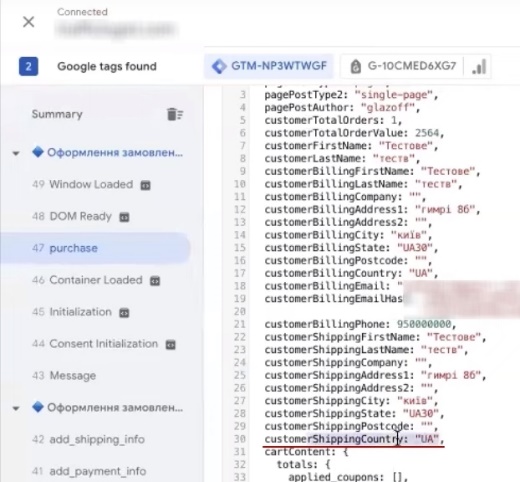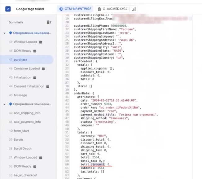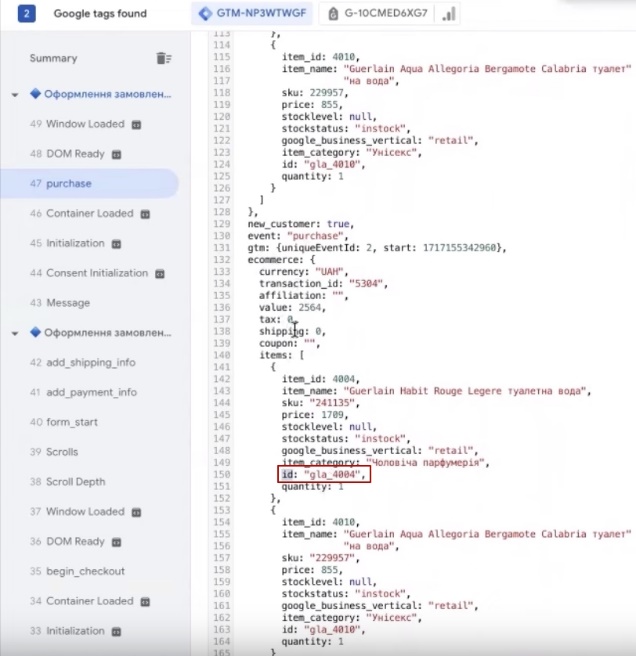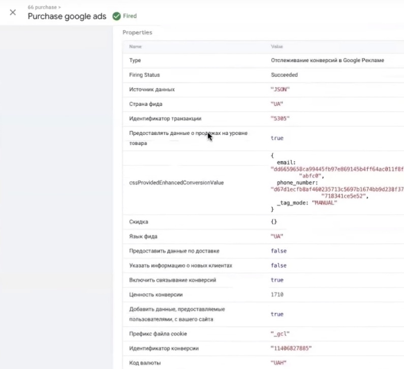 Важливо, щоб purchase Google Ads працював лише один раз. Натискаємо, це шістдесят шостий рядок purchase, натискаємо, перемикаємо на values і дивимося. Ідентифікатор ID транзакції потрібен був – передається. Країна фіда, задавали вручну, – передається. Хешовані дані та email, телефон – передається. Мову фіда задавала вручну, можете не задавати. Цінність конверсії, сума замовлення передається. Нове замовлення зробили. Item-си – передаються. Тут точно є ID і google_bussines_vertical, quantity, price є.