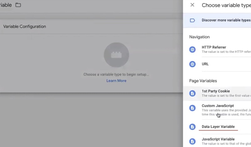 Показую всі можливі варіанти. Що потрібно? Cart. Зараз створимо на Дисконт змінну. Натискаємо плюсик. Сюди. Data Layer Variable.