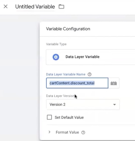 Вибираємо тут. Натискаємо cartContent. Уже прокачане налаштування робимо. Не просто так. Discount_total. Або візьміть те, що збігається з вашим. Discount_total звідси. Його зберігаю. Називаю “змінна з рівнем даних”. Зберігаю.
