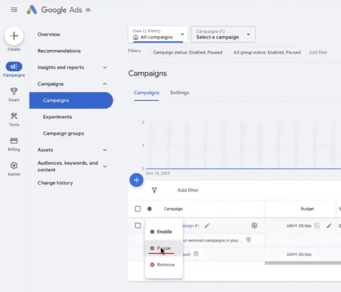 Далі. Дивіться, в акаунті обов’язково йдемо в кампанію, яка створила, буває може не запропонувати створити, завести платіжні дані, на цьому завершити. Зараз зупиняємо на випадок, якщо завели платіжні дані, щоб за налаштуваннями нічого критичного не було.