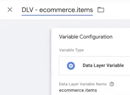 У цьому випадку буде максимально просто. Беру ecommerce, натискаємо плюсик, плюсик. Змінна конфігурація – Data Layer. Ecommerce, крапка. Беру просто item-си, оскільки є ID, quantity параметри. Це, до речі, досить зручно. Ecommerce.Items, DLV. Все.