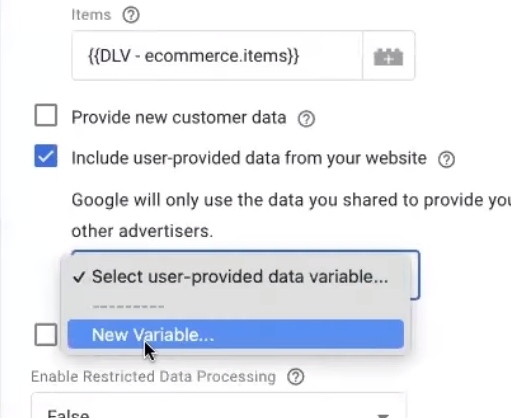 Далі можемо додати кілька пунктів, частина з яких буде принципово важливою. Це потрібно передати User Data. User Data передаємо точно номер телефону та e-mail, але можете ще більший блок даних передати. Що за великий блок чи менший блок, про який говорю? Натискаємо “New variable…”.