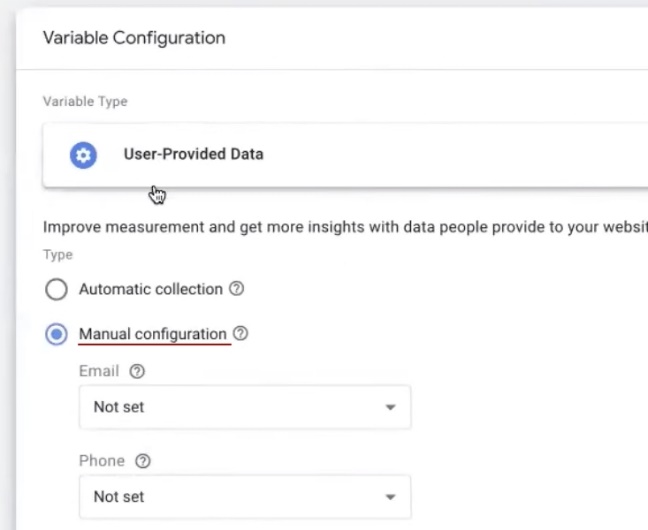 Відкривається тег під назвою User-Provided Data. Обов’язково вибираємо “Ручна конфігурація” і тут почнемо вибирати найрізноманітніші параметри, змінні, точніше. Потрібні змінні. Найважливіші з яких – email і телефон. Це важливо.