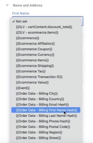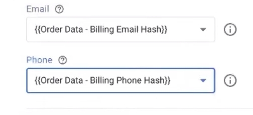 У email-е… Пам’ятаєте, коли завантажували, імпортували контейнер для четвертої аналітики, є купа змінних. Змінні вже готові. Єдине, що залишається – вибрати Billing Email Hash, і для телефону та сама історія – Billing Phone Hash.