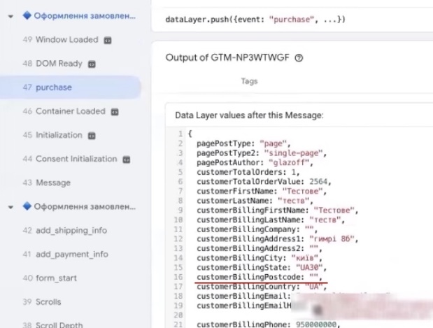 Що стосується імені, прізвища, вулиці, міста, регіону, країни та zip-коду (поштового коду) – це можете вбивати лише в разі, якщо насправді є в рівні даних zip-код. Для України, можливо, це неактуально. Якщо вибираємо Нову пошту – для Нової пошти вже індексу не буде. Передавати цю інформацію для України чи не передавати? Без індексу це не відіграє ролі. Якщо ж запускаєтеся в інших країнах, таких як Європа, Австралія, Канада, Штати – це бажано прямо все проходити. Тут усе задано? Що тут є – First Name Hash, Last Name Hash. Мають тут бути Street, City, Region, Country, Postal code.