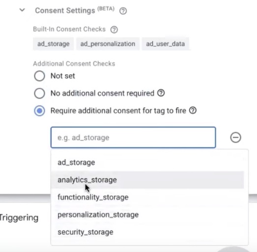 і тут обов’язково виберіть що підходить, що ні. Якщо в Україні, то вона не входить у зону GDPR і Великобританія, тут не потрібен додатковий консент. Якщо ж інша країна – потрібен Consent Mode – вибираєте спочатку згідно з параметрами, що потрібно передавати. Можете вибрати ad_storage або інший з атрибутів. Тут не потрібно налаштовувати Consent Mode.