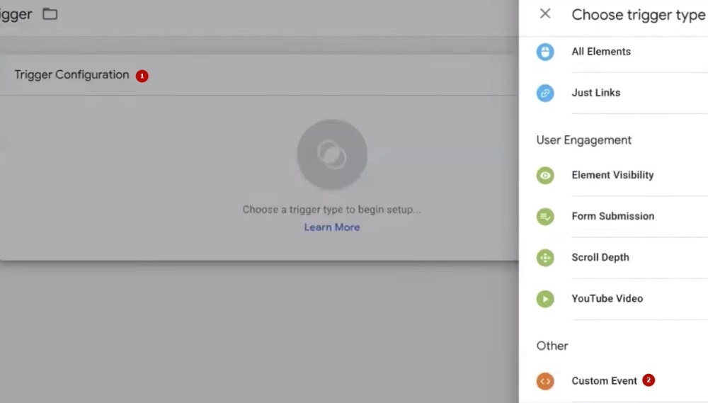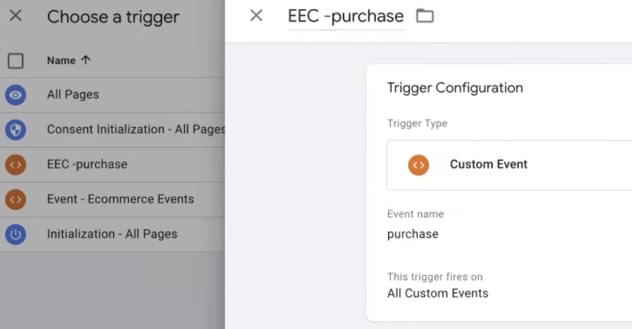 І тригер. Тригер, якщо пам’ятаємо – це подія purchase. Потрібно що? Знайти правильно подію, вставити purchase. Це досить легко робиться. Переходимо в Google Tag Manager, натискаємо плюсик. “Тригер конфігурація”, Event.