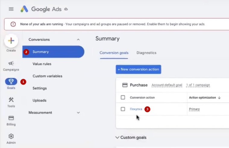 - Налаштування конверсії “Тег покупка”. Встановлення зв’язку з Google Ads