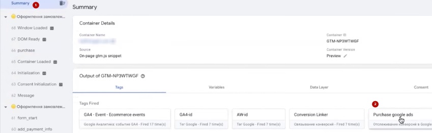 Тепер повертаємося у віконце, знаходимо purchase і обов’язково повинні побачити цю конверсію. Точніше ще раз переходимо на Summary і дивимося, скільки разів кожен із тегів спрацював.