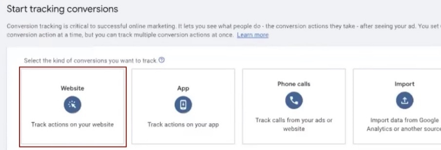 Натискаємо “New conversion action”, вибираємо вебсайт обов’язково. Сюди вписуємо назву сайту, що була.